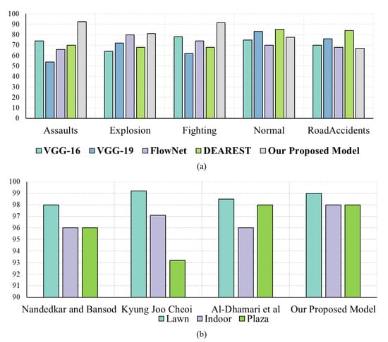 Comparison of class-wise accuracy for the (a) UCF-Crime and (b) UMN datasets of the proposed method with existing methods.