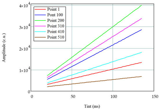 For eleven different characteristic points of the spectrum, the dependence of their amplitudes on TINT was received; the dependences for these points with different initial values of the amplitude on TINT are shown in different colors in Figure 3. The dependence of the amplitude on TINT was plotted for the TINT range from 20 to 135 ms with the step equal to 1 ms, which provided 116 measurements.