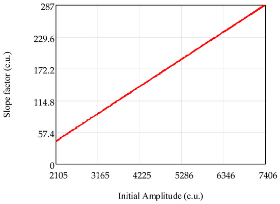 Based on the fact that the slope of the linear dependence (Figure 4) also increases linearly with the increasing amplitude, measured at the initial TINT, the slope of the linear dependence in Equation (2) can be represented as its linear dependence on the initial value of the amplitude, obtained at initial TINT. This statement can be formulated as follows: