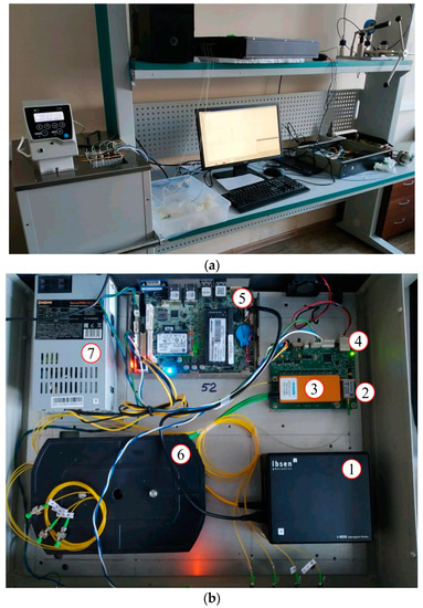 Experimental setup (a); FBG interrogator (b): 1–IBSEN I-MON 512 USB; 2–laser source SLD-761-HP1-DIL; 3–optic channel switch Sercalo MEMS switch rSC 1 × 8; 4–laser source and optical switch maintaining module; 5–computer Wafer ULT-3; 6–optical cross; 7–power supply.