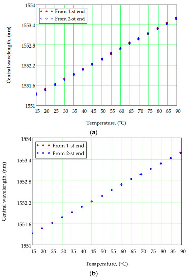 The calibration curves received without and with the spectrum calibration algorithm are presented in Figure 6. All measurements were made for the bore-type temperature sensor FS62WSS (HBM) from two ends. The measurements made from the first end are marked by red rhombuses, and from the second end are marked by blue rhombuses. All measurements were made in the temperature range from 15 to 90 °C with a discrete step of 5 °C. Fifty independent measurements of the FBG central wavelength were made in each temperature point; thus, each rhombus in the figure means one measurement.