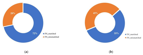 Relationship between FN statistics and common features considered to be FN-related. (a) FN statistics of RRC detector [2] on KITTI Tracking Dataset [14]; (b) FN statistics of SSD detector [15] on KITTI 2D Object Dataset [14]. Factors considered here include truncation (≥0.3), occlusion (≥2, largely occluded), depth (≥50 m), and height (≤25 px), the striped partitions show that for both detectors, more than 28% of FNs do not match any of these factors.