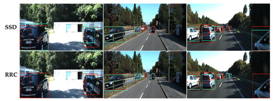 Visual comparisons of ground truth objects (red) and detected objects (green) produced by different object detectors. The first row shows ground truth objects and detections of SSD detector [15] on samples in KITTI Benchmark [14], and the second row shows ground truth objects and detections of RRC detector [2] on the same samples. It can be observed that FN objects missed in the same samples are different for the two detectors.