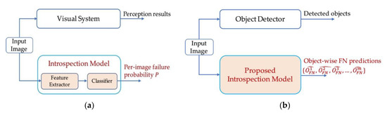 Original concept of introspection and our extension. (a) Original concept of introspection. Failure features are extracted and classified to obtain a per-image failure probability ; (b) Our extension of introspection. The concept of introspection is extended to perform object-wise failure predictions in our work, refers to the th predicted FN object in the input image.