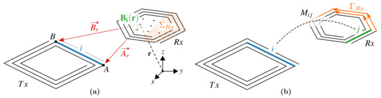 The mutual inductance between two coils is defined by the magnetic flux generated by one coil—which can be considered the transmitter coil —that is linked to the loop of the second coil—or receiver coil —per unit current (Equation (1)). In terms of magnetic vector potential, , the mutual inductance, , is also given by Equation (2), where and are the unit vectors perpendicular to the surface and tangential to the loop respectively, and r is the position where or are evaluated: