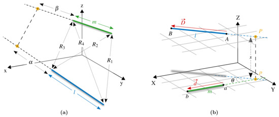 In accordance to Figure 4, the following notation is defined. Points A and B are the three-dimensional vectors of the start and end points of the transmitting filament , respectively. It will be clear in Section 2.2 that A and B could be matrices of n transmitting vectors, such as the filaments composing a coil or a set of coils, allowing for fast vectorial implementation. Analogously, the receiving filament is defined by points a and b. The distances between the end-points of segments and are , , , , as indicated in Figure 4a.