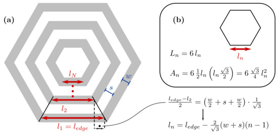To calculate the cross-sectional area and the total length of a hexagonal planar coil, the spiral is approximated as a set of concentric hexagons. (a) The edge length, , of the inner turn depends on the external edge, , and the trace width, w, and spacing, s. In the box (b), formulae for the equilateral hexagon perimeter and area .