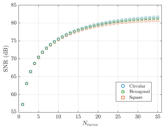 Three coil shapes were compared: a hexagonal coil with a diagonal of 3, and a circular and square planar coils with the diameter and the edge, respectively, defined to give the same footprint area as the hexagonal coil. SNR calculated from Equation (23) is plotted in Figure 6, with variation in turn count.