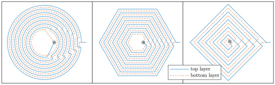 The parasitic capacitance of planar coils is mainly due to the electrical coupling between overlapping traces of different layers [39,40]. To decrease the parasitic capacitance of the coil and maximise the self resonance frequency, the footprints of subsequent layers were designed with shifted traces, as illustrated in Figure 7.