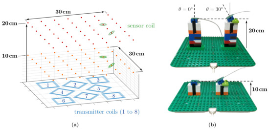 The receiving coil was positioned on a grid of test points laying on a horizontal plane. The experiment was repeated for two distances from the planar transmitter board, 10 and 20, and for two sensor orientations, vertically oriented and with an angle of from the vertical axis, as shown in Figure 10a.