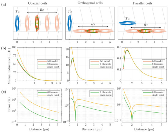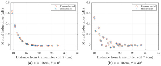 Mutual inductances at test-points were also simulated with the analytical model proposed in Section 2. PCB traces of the transmitting and the receiving planar coils were approximated as 0-radius straight filaments. Previous works demonstrated that this assumption is true almost everywhere apart from the close proximity (approximately less than five times the trace width) to the conductor [42,43].