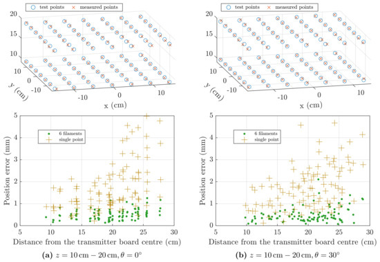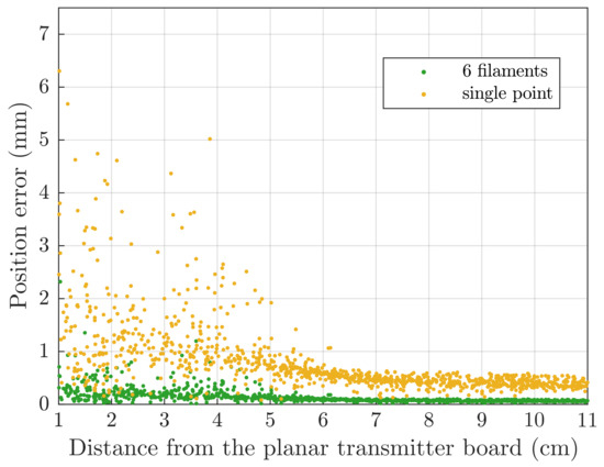 Virtual tracking error is plotted in Figure 13, where it can be seen that the single-point model provides sub-millimetre positioning errors at distances larger than 6 from the transmitter board, while the 6-filament model reaches the same level of accuracy even for closer positions.