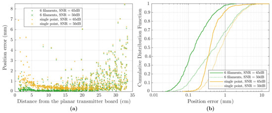 The cumulative distribution function of the error is plotted in Figure 14b and shows that, in the lower noise case, with an average SNR of 65 , almost all the points obtained with the 6-filament model and approximately 90 of the points for the single-point model exhibit sub-millimetre errors. If the external noise is increased, with an average SNR of 50 , the percentages of the points with sub-millimetre errors decrease to approximately 70 and 60 respectively.