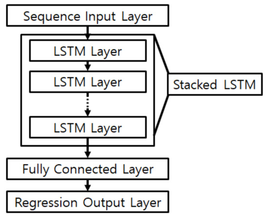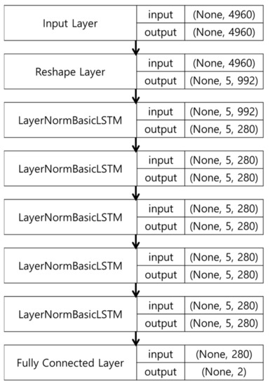 This section proposes a method for creating movement path data using cluster labels and cluster transition matrix of the data calculated by Algorithms 1 and 2. This paper does not consider indoor structures and does not specify start and end clusters. For this reason, the path is created by traversing clusters according to the path length from a randomly chosen cluster [18]. The movement path randomly extracts one data point in the current cluster to generate input data and uses the location point of the last visited cluster as a label. Because the input size of the learning model is proportional to , not only does the amount of computation increase, but so does the amount of old data that is not needed to predict the current location. Hence, considers a time interval over which the RSSI and device performance is collected. The generated movement path data consists of RSSI data for each AP over time, so a long short-term memory (LSTM) layer for time-based data can be used, as shown in Figure 1.