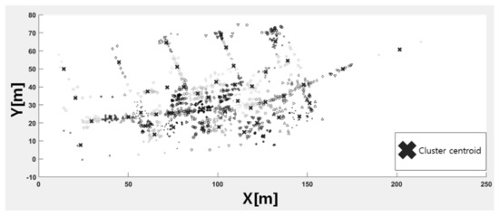 Figure 3 shows the results of applying the location points of the TUT Wi-Fi fingerprint dataset to the K-means clustering of Algorithm 1. In Figure 3, the X marks the center of the cluster and the other symbols indicate the location of data point. To distinguish the cluster to which the data point belongs, when marking the data point, the symbol (e.g., triangle, plus signal, circle, etc.) and color are expressed differently. The sum of the distances between the centers of the clusters and the observation points averages 438.36 m, with a minimum distance of 52.66 m and a maximum distance of 972.19 m.