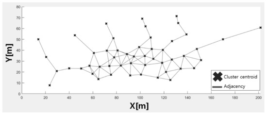 Figure 4 shows the result of generating a neighbor list between midpoints of a cluster. The cluster on the right side of the figure is connected to the nearest cluster because the distance to all clusters is greater than the distance limit. This paper does not consider the building structure, however it can generate a neighbor list similar to that of the TUT dataset.