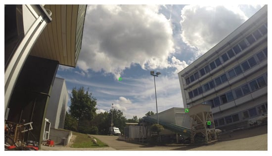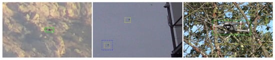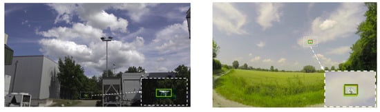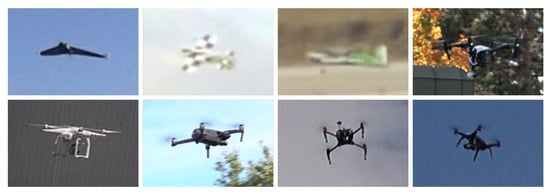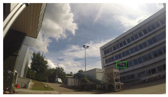 The Flying Object Detection from a Single Moving Camera dataset [] comprises 20 video sequences with UAVs. Each image has a resolution of 752 × 480 pixels and contains up to two objects of the same model. The video sequences are recorded by a camera mounted on a flying drone. The variable appearance of drones due to changing attitudes, lighting conditions, and even aliasing and saturation caused by small sizes makes the dataset challenging. In addition, 20 video sequences with aircraft retrieved from Youtube are provided. The image resolution of these video sequences varies between 640 × 480 to 1280 × 720 pixels.
