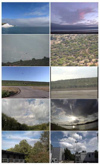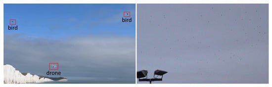 A Drone vs. Bird Detection Challenge has been launched (https://wosdetc2020.wordpress.com/Dronevs.Bird-detection-challenge/, accessed on: 14 April 2021) in 2017, during the first edition of the International Workshop on Small-Drone Surveillance, Detection and Counteraction Techniques (WOSDETC) [] organized in Lecce, Italy, as part of the 14th edition of the IEEE International Conference on Advanced Video and Signal based Surveillance (AVSS). A second edition of the challenge has been organized in 2019, again as part of the WOSDETC and held at the 16th edition of AVSS in Taipei, Taiwan. The aim of this challenge is to address the technical issues of discriminating between drones and birds [,]. Given their characteristics, in fact, drones can be easily confused with birds, particularly at long distances, which makes the surveillance task even more challenging. The use of video analytics can solve the issue, but effective algorithms are needed that can operate under unfavorable conditions, namely weak contrast, long range, low visibility, etc.