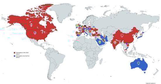 In this edition of the challenge, 23 teams from different countries requested the dataset, but only three of them succeeded in submitting valid results. In Figure 5, an overview of the nationalities of the teams that participated in the 2020 edition of the Drone vs. Bird challenge (marked with red color) is given, together with a more general overview of all the 108 research groups who requested the challenge dataset since its first edition (marked with blue color).