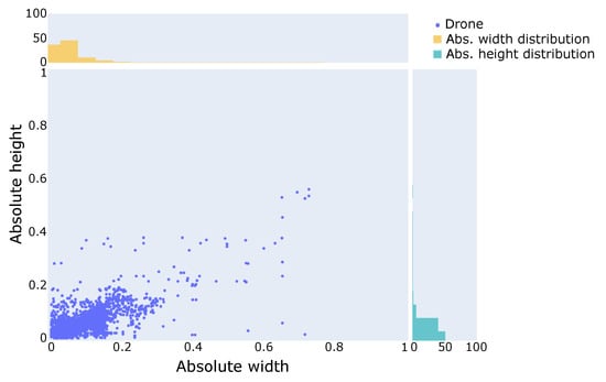 Recently, the Real World Object Detection Dataset for Quadcopter Unmanned Aerial Vehicle Detection [] has been published. The dataset consists 51446 images for training and 5375 images for testing. The images are either downloaded from the Internet or recorded by the authors. As the original image resolution is in the range between 640 × 480 pixels and 4 k, all images are scaled to 640 × 480 pixels. The train set comprises 52,676 drone instances, while the test set only contains 2863 drone instances, so that 2750 images of the test set do not contain any drone. A semi-automated labelling pipeline has been used to speed-up the annotation task. In the train set, about 40.8% of drones are smaller than 322 pixels, while 23.4% are larger than 962 pixels. In the test set, approximately 36.3% of drones are smaller than 322 pixels, while 28.3% are larger than 962 pixels.