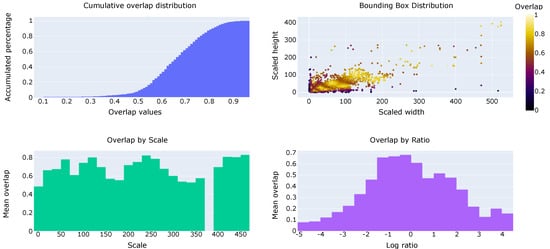 Figure 7 shows four different plots that summarize the result of this matching. In the upper left corner it can be observed a cumulative overlap distribution over the matching results. Less than a 10% of the total bounding boxes have maximum overlap values below 0.5, this is, only less than a 10% ground truth bounding boxes will not influence the training (when the augmentation effects are not taken into account). Upper right corners show the distribution of the bounding boxes dimension, color intensity represents the maximum overlap that each of them obtain after matching with generated anchors. Most low matches, represented with dark colors, are produced for extreme scale ratios. Finally, two bottom plots represent an histogram with relation between bounding scale and mean overlap (left) and log scaled scale ratios.