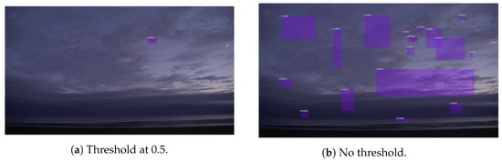 All experiment results have been obtained over the previously mentioned validation dataset which consist of 16 videos. Although competition results are evaluated against AP@0.5, this metric is not useful for evaluating how a model would perform in real world []. In such situations, a confidence threshold for discarding low quality predictions and fusing its result with other sensors must be provided. All these facts are not taken into account with AP which suggests the use of other metrics that better align with real applications. In addition, most datasets for drone detection include very few categories (usually one) and often just an object per image. Under these settings, the AP ignores all false positives as long as the prediction with the higher confidence is assigned to the object of interest, as illustrated in Figure 8, where both images obtain the same AP (1.0–1.0) but a huge gap in moLRP (0.0–0.944).
