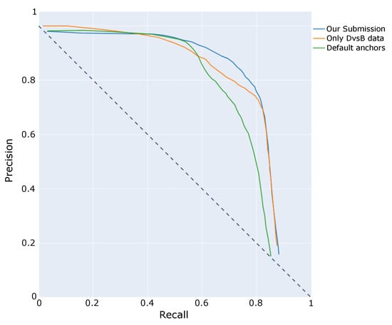 Figure 9 reports a precision versus recall at IoU score of 0.5 comparison of the three different models. It can be easily observed how default anchors model has the worst performance, which shows the importance of designing a proper anchor set for object detection problems like the one in this challenge. Differences between final submission and the model trained only with a reduced dataset are highlighted when model threshold is increased, whereas the final submission is able to maintain higher recall values.