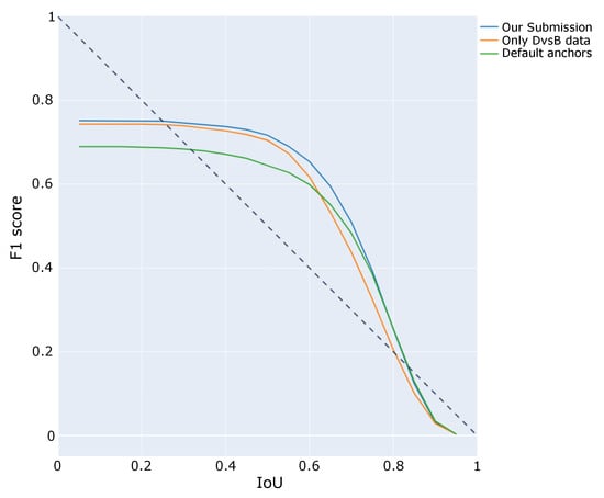 A similar comparison is shown in Figure 10 where different IoU values and their corresponding F1-score values are plotted for each of the trained models. Once again, best results are achieved by the submitted model. For larger IoU values the three of them converge to similar scores and this is due to the difficulty of achieving large IoU values for very small ground truth objects, where small differences result in large changes in IoU.