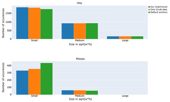 In Figure 11, a comparison between the number of hits (true positives) and misses (false negatives) is shown. Ground truth bounding boxes are divided in three different categories depending on their scale, so that one can visualize how models perform with respect to target sizes. It is clear that main differences occur for small drone detection, where models trained with our custom anchor set are able to achieve a higher number of hits and at the same time reduce the number of misses. This fact supports the decision made by Gradiant Team of creating specific anchors suitable to match small drones during training and increase the capabilities of the model for detecting them.