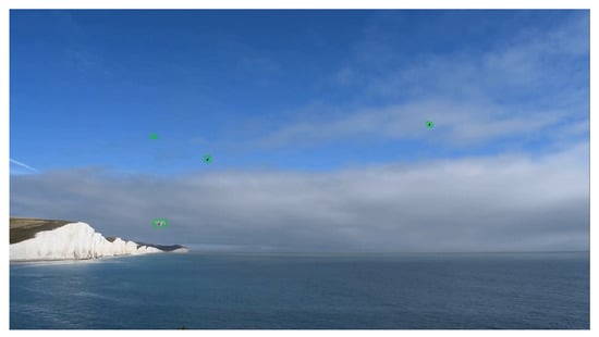 The Small Target Detection database (USC-GRAD-STDdb) [] comprises 115 video segments retrieved from YouTube. The image resolution is 1280 × 720 pixels and annotations are provided for more than 25,000 frames. In total, more than 56,000 small objects whose sizes are in the range between 4 × 4 and 16 × 16 pixels are annotated. The small objects are categorized into drone, bird, boat, vehicle and person. 57 video segments with 12,139 frames contain either drones or birds.