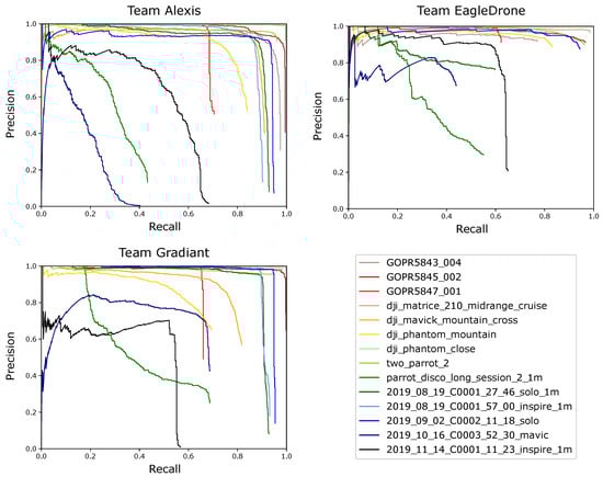 Further insight into the resulting scores can be gained from Table 6, which compares the number of present ground truth objects to the number of submitted detections, resulting recall and implicitly the number of false detections. It can be observed that the Eagledrone team generated much fewer detections, resulting in fewer false positives but also negatively impacting the overall recall and resulting AP. Conversely, the other two teams’ results exhibit very large numbers of detections, and thus many false positives, for some of the test sequences. Naturally, such large numbers of detections result in better recall. The fact that also AP is comparatively good indicates that many of these false positive detections are of a very low confidence score and thus do not affect AP very strongly and could be filtered out in practical application.