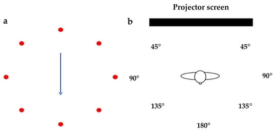 (a) A representation of the video screen for 180°; (b) participants completing standing turns on level ground through 180° in each speed from audio signals and either to the left (counter-clockwise) or the right (clockwise).