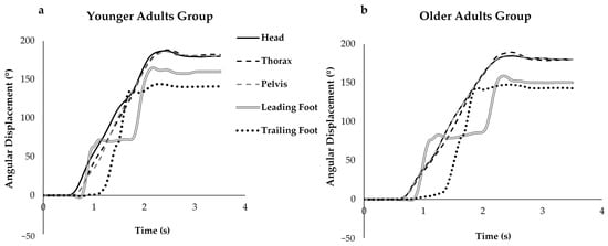 Turn displacement raw data from one trial of moderate speed in (a) younger adults group and (b) older adults group. This shows that segment reorientation began with the rotation of the head, followed by the trunk, pelvis, and the leading and trailing foot, which was seen in both groups.