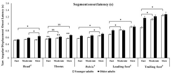 Bar graph showing the mean onset latencies with turn speed. There was a significant main effect of turn speed on the timing of reorientation onset for all segments. Values are mean ± SEM. # Indicates a significant interaction (p < 0.05) from MM ANOVA. * Indicates post-hoc pairwise comparisons of turning speeds within-group from RM ANOVA. ** Indicate main effects of group and turning speed from MM ANOVA. m Indicates post-hoc pairwise with a Bonferroni adjustment for multiple comparisons from MM ANOVA.