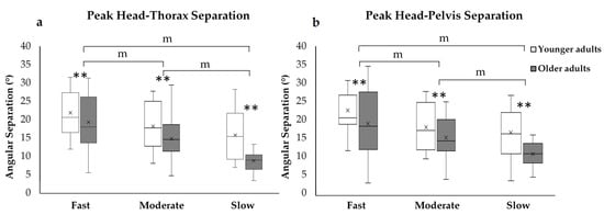 The effects of turning speed on mean (a) peak head–thorax angular separation and (b) peak head–pelvis angular separation under both conditions. The box and whisker plots illustrate the median peak head–thorax angular separation and peak head–pelvis angular separation. ** Indicate main effects of group and turn speed from MM ANOVA. m Indicates post-hoc pairwise with a Bonferroni adjustment for multiple comparisons from MM ANOVA.