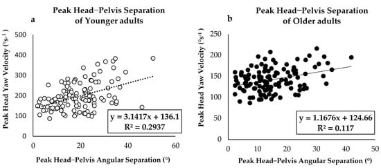 Scatterplot showing the results of regression analyses between peak head yaw velocity and maximum head-pelvis angular separation in (a) younger adults group and (b) older adults group, a significant positive correlation between peak head yaw velocity and the head-pelvis separation was found between groups (p < 0.05).
