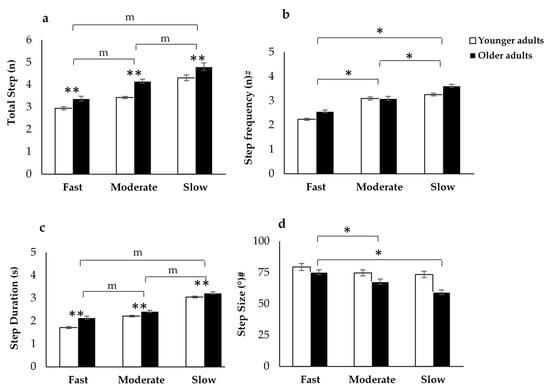 The effect of turn speed on (a) total step counts, (b) step frequency and (c) step duration taken to turn and (d) step size. Values are mean ± SEM. # Indicates a significant interaction (p < 0.05) from MM ANOVA. * Indicates post-hoc pairwise comparisons of turning speeds within group from RM ANOVA. ** Indicate main effects of group and speed from MM ANOVA. m Indicates post-hoc pairwise with a Bonferroni adjustment for multiple comparisons from MM ANOVA.
