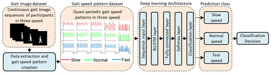 Artificial intelligence (AI) techniques such as machine learning and deep artificial neural network methods successfully applied and provided new predictive models for complex gait analysis [29,30]. Therefore, a good classification method is needed for the classification of any gait-related task (e.g., walking speed patterns) with reliable and good accuracy [15]. Among the published studies on walking speed estimated from lateral-view 2D images of marker-less walking individuals [21,22,27], only that conducted by Zeng et al. directly investigated an individual’s walking speed classification; these researchers employed the radial basis function (RBF) neural network to solve the classification task [27]. More recently, Khokhlova et al. reported a strongly predictive performance model with a large capacity to learn, the ability to capture long-term temporal dependencies, and the capacity to use variable-length observations that was developed based on the recurrent neural network (RNN)-based deep learning (DL) method long short-term memory (LSTM) for sequential data classification [15]. Additionally, some other image-related classification tasks, such as handwriting recognition [31], speech recognition [32], and text classification [33], have been performed using LSTM and its successor methods (e.g., bidirectional LSTM (biLSTM) and convolution neural network LSTM (CNN-LSTM)). In support of this, LSTM approaches are also currently gaining popularity for clinical gait classification tasks, such as pathological [15] and impairment gait classification [34], due to their promising applicability in labeling sequential gait data. Furthermore, previous research studies have shown that biLSTM exhibits better classification accuracy than LSTM [35]. In general, both the biLSTM and LSTM DL methods need large datasets for training and validation purposes to obtain good accuracy and to avoid data overfitting and poor generalization [36,37]. However, there is lack of availability of sources (i.e., databases) providing a large clinical gait dataset, particularly of lateral-view 2D images of marker-less individuals walking over different ranges of controlled walking speed trials [38,39]. More specifically, there is a limited number of datasets consisting of a small number of subjects with lateral-view image sequences, few variations among controlled walking speed trials, and data collected in limited environments (e.g., either indoor or outdoor settings) that exhibit restricted licensing for public use [21,40]. To overcome this complexity, our study used large gait-related datasets from two publicly available state-of-the-art databases, namely, the Osaka University—Institute of Scientific and Industrial research (OU-ISIR) dataset A [41], and the Institute of Automation at the Chinese Academy of Sciences (CASIA) dataset C [42]. These publicly available image datasets from these two databases were recorded in large populations using lateral-view videos of walking individuals obtained using a single 2D camera (marker-less) and exhibit substantially varied controlled walking speed trials. The gait data from OU-ISIR dataset A and CASIA dataset C were obtained in indoor (treadmill) and outdoor (overground) settings, respectively. A number of previous studies have used these two datasets for vision-based gait recognition and obtained a reliable performance [43,44,45]. One prominent study by Verlekar et al. [46] suggested that images from both datasets could be a possible solution for studies on walking speed pattern recognition that need a large population dataset of lateral-view 2D images of marker-less walking individuals. However, to our knowledge, walking speed patterns have not been previously classified using these datasets and state-of-the-art computational intelligence techniques, such as the biLSTM DL algorithm, to obtain the most reliable and highest accuracy.