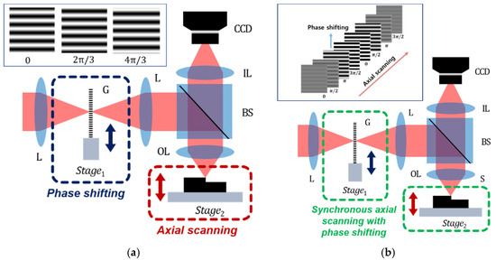 where I1, I2, and I3 are the intensities with the phase shifts of 0, 2π/3, and 4π/3, respectively. It is noted that the lateral coordinate (x,y) is omitted in Equation (1) for simplicity. As the specimen is axially moved, SIM can obtain the visibility curves for all pixels of the camera and detect the positions of the maximum visibility points to reconstruct the 3D surface profile of the specimen. However, the axial motion of the specimen is not synchronized with the lateral motion of the grid in SIM, and is operated in the so-called ‘stop-and-go’ method for extracting the visibility of the pattern at each axial position of the specimen.