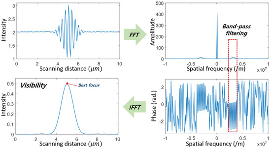 A continuously scanning SIM (CSSIM) [14] uses the synchronization between the lateral phase-shifting of the grid and the axial motion of the specimen to reduce the measurement time caused by the ‘stop-and-go’ method of SIM. In CSSIM, the visibility curve of each pixel corresponding to the surface height can be extracted from the axial intensity variation by a Fourier transformation (FT) and an inverse Fourier transformation (IFT), as shown in Figure 2. A simple mathematical model of the axial intensity signal at a single pixel in CSSIM can be expressed with the peak position () and axial scanning position () [15] as