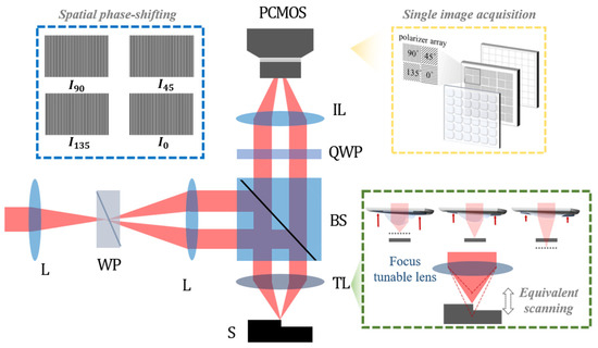 Optical configuration of the motionless polarizing structured illumination microscopy (MP-SIM); L, lens; WP, Wollaston prism; BS, beam splitter; TL, focus tunable lens; S, specimen; QWP, 45° rotated quarter-wave plate; IL, imaging lens; PCMOS, polarization pixelated camera.