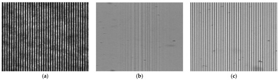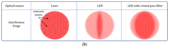 As shown in Figure 6a, the illumination pattern using a He–Ne laser had the highest contrast, but the image contained the coherent noises like stains. Additionally, the pattern kept having high contrast in spite of the axial scanning of the mirror. On the other hand, the pattern using a white LED was localized, and only appeared near the central area of the image as shown in Figure 6b because of the low coherence. These two patterns were not well matched to the conditions of the illumination pattern in SIM because of severely high and low coherence characteristics. To mitigate this, a narrow band-pass filter with 1 nm bandwidth was used with the white LED in this investigation, which means the light has intermediately low temporal coherence to extend the pattern area and low spatial coherence to eliminate the coherent noises. As the result, the pattern clearly appeared at the whole area of the imaging plane without significant coherent noises as shown in Figure 6c.