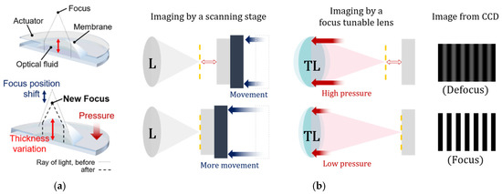 The axial scanning of the specimen in typical SIM is replaced with the adjustment of focal length of the TL in MP-SIM. A focus tunable lens consists of a membrane, optical fluid, and an electric coil as shown in Figure 5a. When the current is applied to the coil, the pressure corresponding to the current is induced in the fluid, which varies the shape of the membrane, especially the center thickness of the lens. In this case, the focus adjustment of the TL is as same as the axial scanning of the specimen, as shown in Figure 5b.