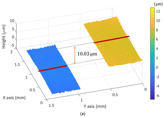 In order to verify the performance of MP-SIM, two kinds of specimens, such as step height sample with a discrete surface profile and a concave mirror with a continuously smooth surface, were measured. The step height sample was prepared with two gauge blocks (Grade 2, Mitutoyo) with 1.13 mm and 1.14 mm lengths, as shown in Figure 8a, and MP-SIM measured the surface profile of the boundary area of two gauge blocks. Figure 8b shows four phase-shifted illumination patterns on the surfaces of both gauge blocks as the current of the focus tunable lens increased. As shown in Figure 8b, the illumination pattern appeared at near the best focus of MP-SIM. Using Equation (5), the visibility of the pattern at each pixel of the PCMOS was calculated, and the 3D surface profile was reconstructed as shown in Figure 9a. As a result, the step height was calculated as 10.03 µm, corresponding to the height difference between two gauge blocks. For the repeatability, 10 consecutive measurements were performed, and the standard deviation of the measured step heights was calculated as 0.05 µm. The concave mirror with a 100 mm radius of curvature was also measured with the same optical configuration. Similar to the step height specimen, the surface profile was reconstructed as shown in Figure 9b. As a result of the radius of curvature calculation, it was 99.6 mm, similar to the specification of the manufacturer. The repeatability was 0.2 mm.