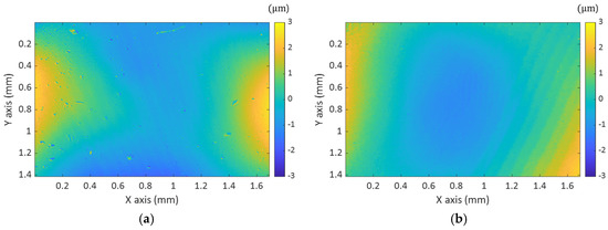 As shown in Figure 10a, astigmatism affected the shape of the mirror, and the surface was seriously distorted. After the optical axes are in line, the astigmatism was reduced, but the measured surface was still curved, caused by the spherical aberration as shown in Figure 10b. To eliminate this aberration effect in this investigation, MP-SIM was calibrated with the measurement result of a plane mirror as accomplished in other techniques such as Moiré [31], and deflectometry [32]. Before measuring the specimen, a plane mirror was measured, and the result was subtracted from the measurement result of the specimen. Even though the optical design of the 4-f system further reduces the aberrations of the system, in this case, the system can be bulky, and the calibration with the measurement result of a plane mirror is more effective because it can reduce the systematic error, except for the aberrations.