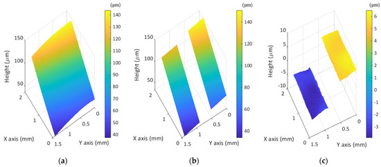 (a) inclined plane mirror result, (b) inclined step height sample result, and (c) calibrated result of a step height sample.