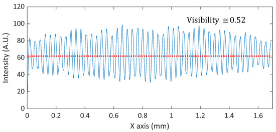 where is a nominal intensity. and mean the modulation frequency and the initial phase caused by the phase-shifting of the sinusoidal pattern, respectively. In order to obtain the visibility curve from , an FT is applied to Equation (2), and the result is inversely Fourier transformed after being band-pass filtered to select only a positive term in the Fourier domain. Then, the filtered intensity () can be derived as