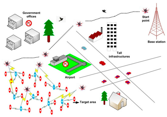 Moreover, UAVs are suitable for use in wireless sensor networks (WSNs) as mobile sinks to collect data from sensors powered by limited energy and then transfer them to the base station (BS) [9,10]. Typically, UAVs are incorporated in WSNs to minimize the energy consumption of sensor nodes. In most WSN applications, sensor nodes are deployed in areas where replacing or recharging the batteries of small and energy-constrained sensors is challenging or impossible. In our study, we used a UAV as a mobile data collector in WSNs in emergency environments. The emergency environments indicate post-war and post-disaster scenarios that lack a fully connected network of sensor nodes (SNs) [11,12]. We cannot rely solely on arrangements built previously, as the established network might not remain or function [13]. The use of UAVs to support SNs is promising for infrastructure-less integration. Hence, UAV-aided WSNs (UWSNs) are investigated in this study to reduce the energy consumption of sensors [14] and minimize the network latency.