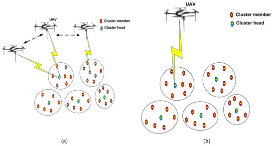 We consider a UAV scenario as a mobile data collector to gather information from a set of N sensors, denoted as . The position of the sensor Sn is expressed as. Clustering sensor nodes is crucial to lessen the network delay and avoid collision during the data collection period. Therefore, sensor nodes are clustered using the unequal clustering algorithm, as discussed in [43,44]. At first, sensor nodes share their head status (i.e., node identifier, residual energy, and location coordinates) to all the sensor nodes within their range. The node with the highest energy is chosen as CH for that region. If any node is selected as CH, no other CH will be selected within its competition range. After a CH is nominated, sensor nodes send a join request to the CH. Then, the CH selects its cluster members based on distance and the number of cluster members it can accommodate. CHs are accountable for gathering data from their cluster members before UAV arrives. At every round, after UAV-to-CH communication, the remaining energy of CH is compared with the minimum energy required to be CH. If the remaining energy of a CH is lower than the minimum required energy, the CH selection process is restarted.