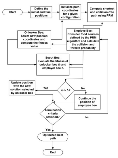 The proposed hybrid algorithm aims to navigate the most acceptable flight route in a complex environment without colliding with environmental elements by combining the PRM [26] and ABC [27] algorithms. Besides this, optimization of the different environments is considered to achieve the best possible path. PRM and ABC’s hybridization and optimization have not yet been tested to the best of our knowledge. However, a hybrid of PRM and ABC provides a better convergence rate and accuracy than other algorithms. In the proposed HPP, the PRM roadmap is used as an input by the ABC algorithm, where a swarm of bees (particles) coordinates with different environmental constraints to obtain the shortest and safest path.